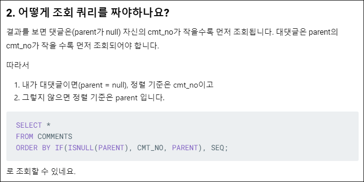 FROM comment_table A LEFT OUTER JOIN comment_table B ON A.parentId = B.id -- 부모